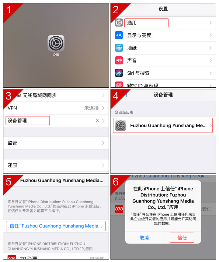 2、在手机找到「设置」—「通用」—「设备管理」—「Fuzhou Guanhong Yunshanng Media Co., Ltd」- 点击「信任」- 返回桌面点击078就可以开始使用了。